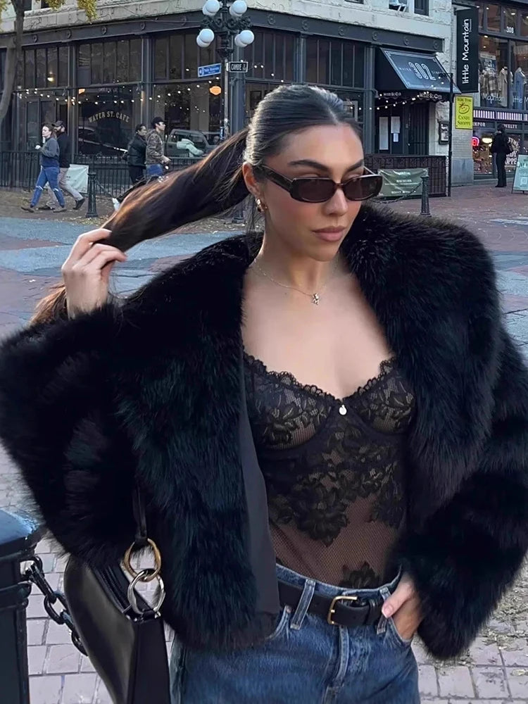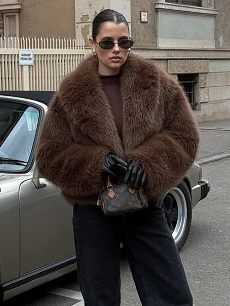 Dieser Kunstpelzmantel präsentiert eine luxuriöse Silhouette mit einem übergroßen Revers und langen Ärmeln. Die entspannte Passform sorgt für einen eleganten Lagenlook, der sowohl stilvoll als auch komfortabel ist.